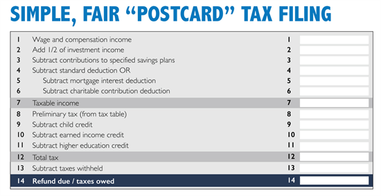 Our plan makes filing your taxes as simple and easy as filling out a post card. It gets rid of the loopholes and special perks that the well-connected have set up for themselves, and brings down the rates for everyone.