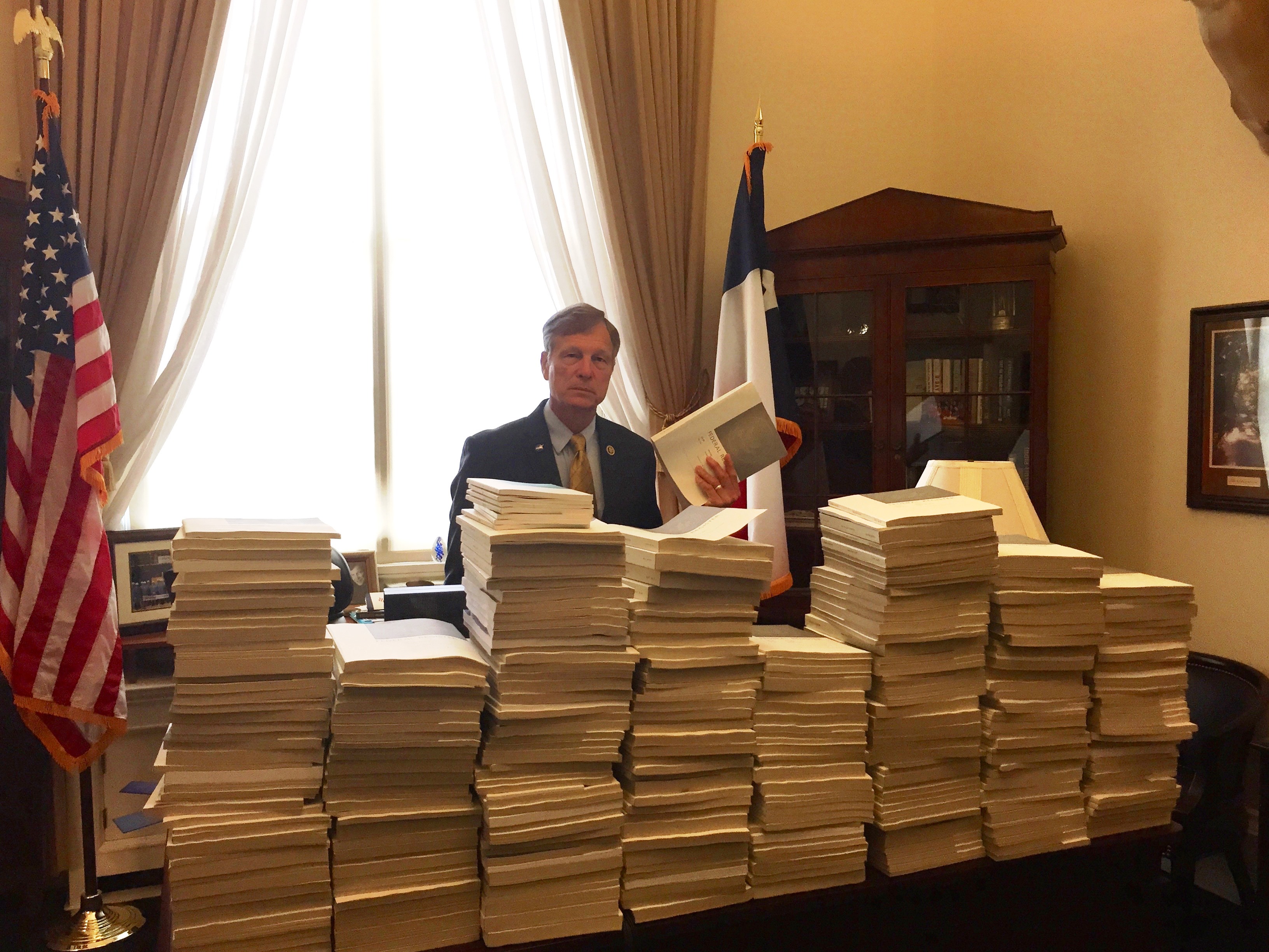 It was Ronald Reagan who told us that the closest thing to eternal life is a federal program. Federal regulators, particularly under the Obama Administration, have been working overtime to expand their authority. This stack of papers is what’s called the Federal Register. It’s made up of proposed and final regulations that have been issued by unelected, unaccountable Washington bureaucrats since I was sworn into office in January 2015. This is just 18 months of regulations!