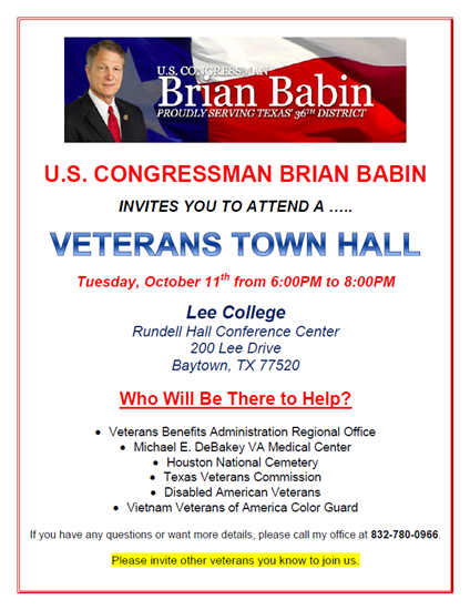 Please join us this coming Tuesday, October 11th, from 6-8pm, for a Veterans Town Hall meeting at Lee College in Baytown, Texas. We have brought together a team of experts to help answer questions about accessing VA health care and education benefits, navigating the claims process, determining discharge status, transitioning into civilian life and much more. Please invite other veterans you know to join us too. If you have questions or want more details, call my office at 832-780-0966. We hope to see you there! To view the invite, please click here.