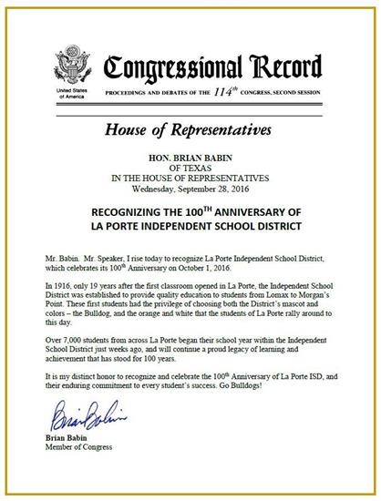 Beverly also presented La Porte ISD with a Congressional Record statement celebrating their 100th anniversary. To view more pictures from the event, click here.