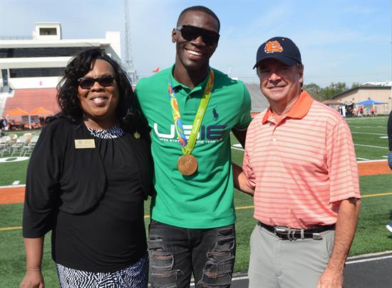 Our Regional Director of Community Relations, Beverly Ferguson, attended La Porte ISD’s 100th Anniversary Celebration where she presented U.S. Olympic Gold Medalist Kerron Clement of La Porte, Texas with a Congressional Certificate and flag flown over the U.S. Capitol on the same day he won the 400-meter hurdles at the 2016 Rio Olympics.