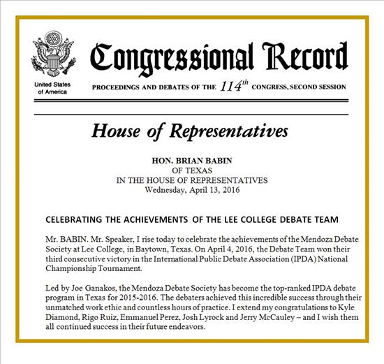 I had the opportunity to present a Congressional Record Proclamation honoring the achievements of the Mendoza Debate Society at Lee College, in Baytown, Texas, for winning their third consecutive victory in the International Public Debate Association (IPDA) National Championship Tournament. Led by Joe Ganakos, the Mendoza Debate Society has become the top-ranked IPDA debate program in Texas for 2015-2016. The debaters achieved this incredible success through their unmatched work ethic and countless hours of practice. I extend my congratulations to Kyle Diamond, Rigo Ruiz, Emmanuel Perez, Josh Lyrock and Jerry McCauley – and I wish them all continued success in their future endeavors.